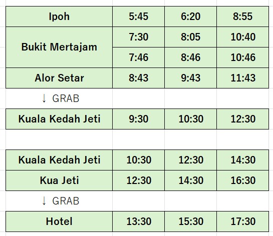 | Kangar発 → Kuala Perlis Jeti着 | Kangarに10:05〜10:15頃に到着後、次のバスに乗り継ぎ |
